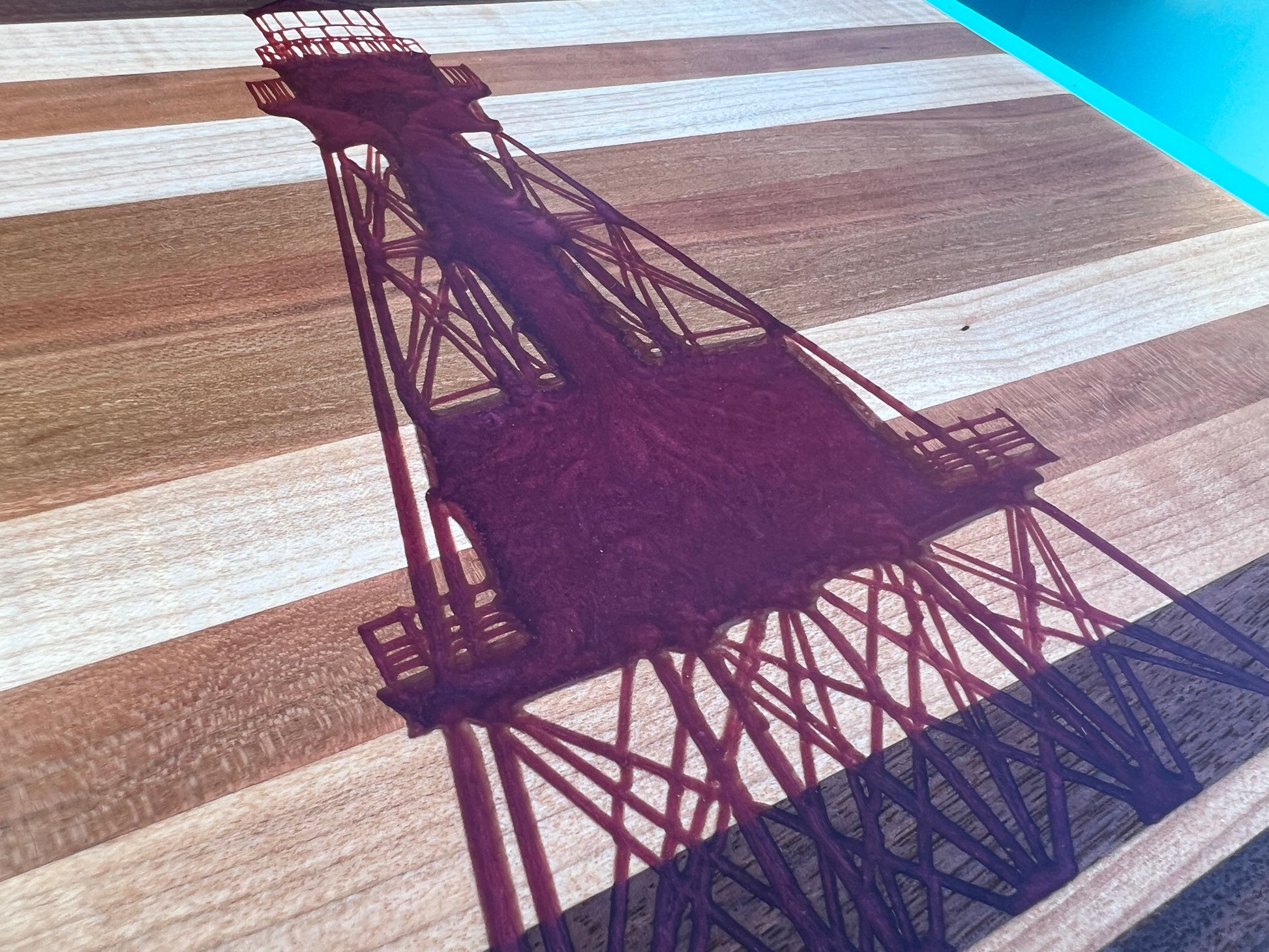 Crafted from premium walnut, hickory, and cherry woods, this charcuterie board showcases a meticulously carved and epoxy-coated depiction of the American Shoal Lighthouse. Expertly sanded to a flawless finish, the board’s reverse side features a blood groove designed for meat carving and ideal for serving charcuterie, combining functional design with artistic craftsmanship.