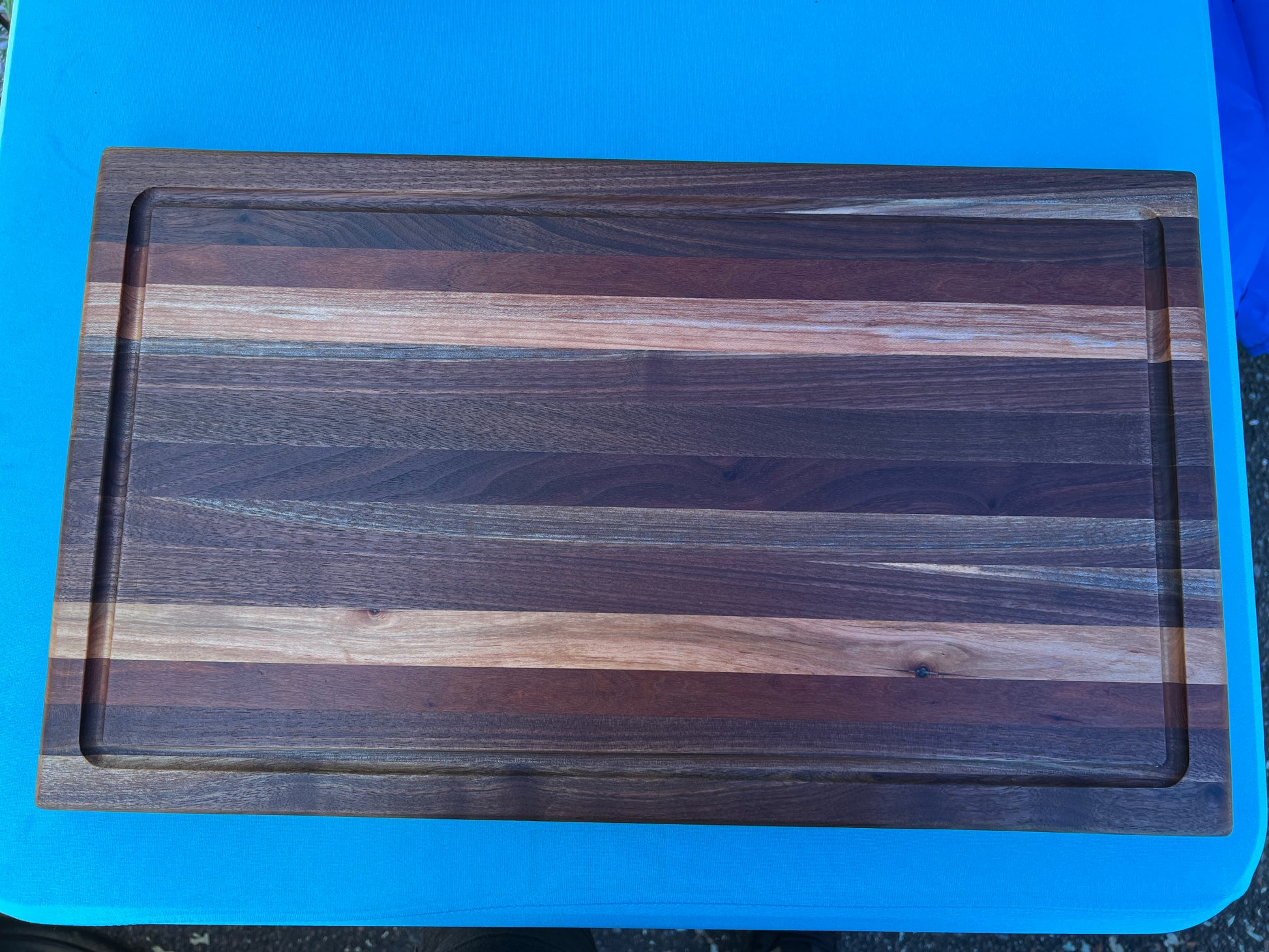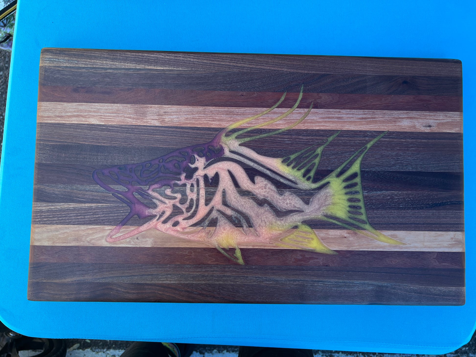 Crafted from premium walnut, hickory, and cherry woods, this Hogfish Charcuterie Board showcases expert craftsmanship. Each board is meticulously carved to highlight a stunning hogfish design, then sealed with durable epoxy for lasting beauty and protection. Finished with precise sanding to a flawless smoothness, it combines artistic detail with practical functionality—ideal for serving with style and elegance.