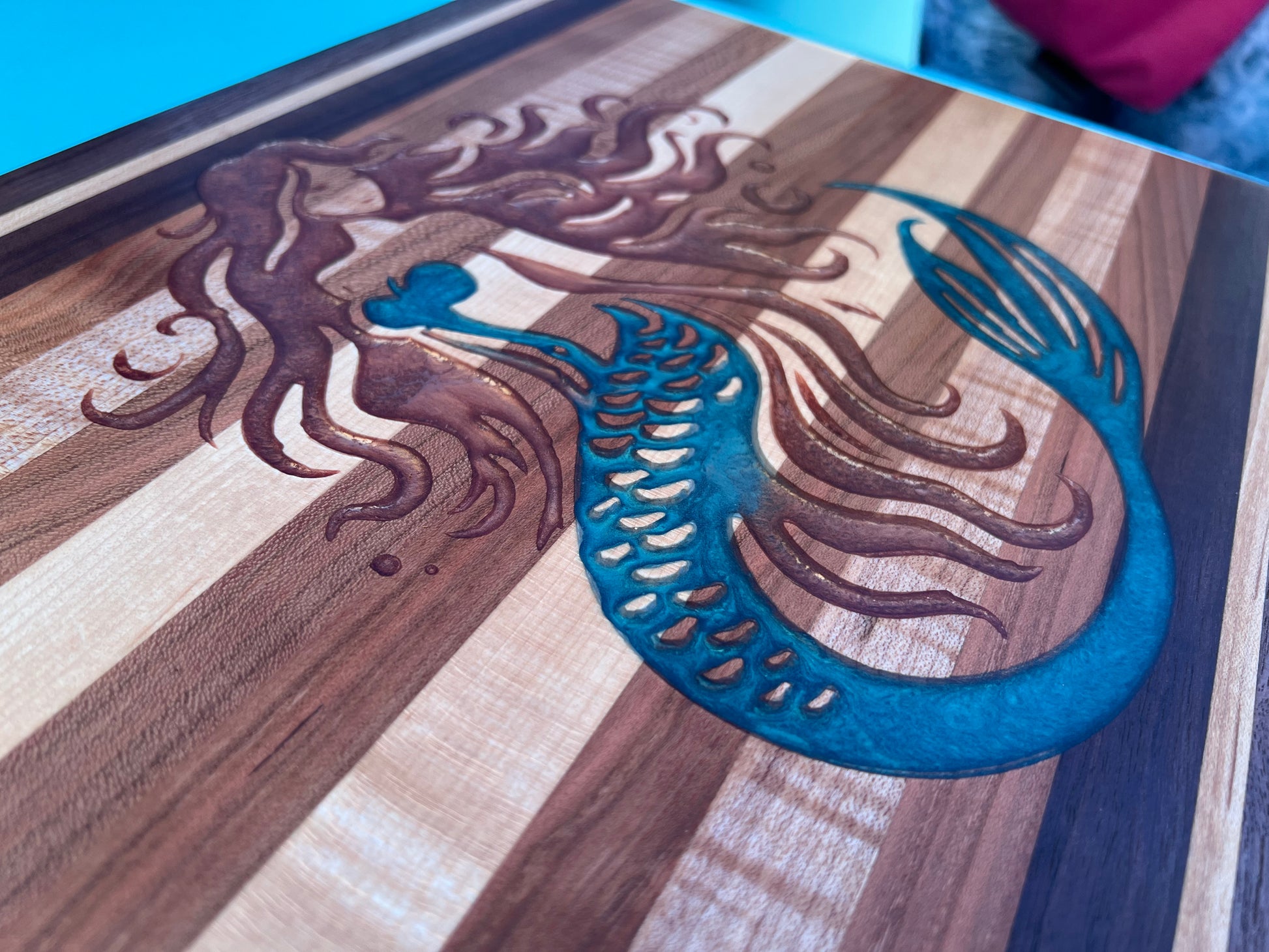 Crafted from premium walnut, hickory, and cherry woods, this Mermaid Charcuterie Board showcases expert craftsmanship. The intricately carved mermaid design is sealed with epoxy for durability and detail preservation. Its smooth, sanded surface ensures a refined finish, while the back features a practical blood groove, making it ideal for slicing meats and serving as an elegant charcuterie centerpiece. Perfect for both functional use and display, this board combines artistry with utility.
